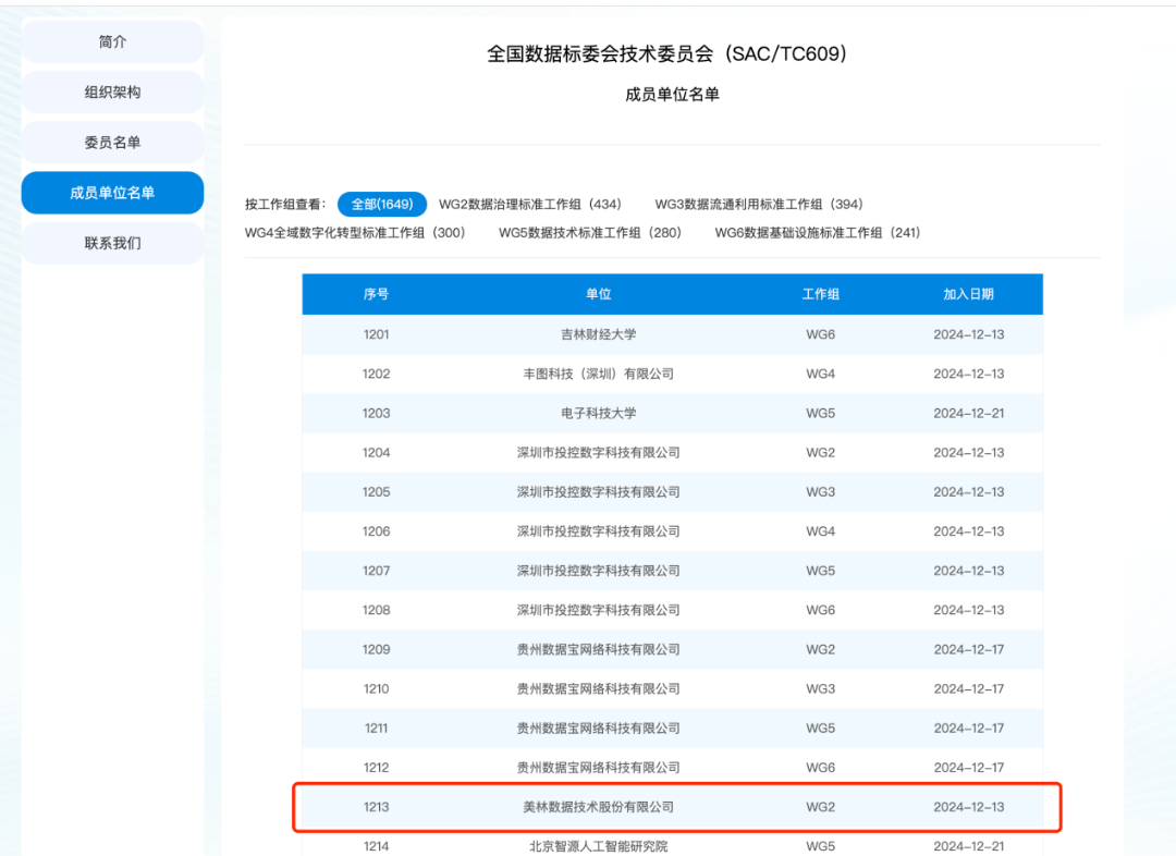 全國(guó)數(shù)標(biāo)委成立于2024年10月,是經(jīng)國(guó)家標(biāo)準(zhǔn)化管理委員會(huì)批準(zhǔn)設(shè)立的,從事數(shù)據(jù)領(lǐng)域國(guó)家標(biāo)準(zhǔn)化工作的專業(yè)技術(shù)組織。全國(guó)數(shù)標(biāo)委的籌建單位和業(yè)務(wù)指導(dǎo)單位為國(guó)家數(shù)據(jù)局,秘書(shū)處承擔(dān)單位為中國(guó)電子技術(shù)標(biāo)準(zhǔn)化研究。此次美林?jǐn)?shù)據(jù)成功入選,標(biāo)志著公司成為全國(guó)數(shù)據(jù)標(biāo)準(zhǔn)化技術(shù)建設(shè)的重要力量之一,將繼續(xù)深化參與國(guó)家層面的數(shù)據(jù)標(biāo)準(zhǔn)化工作,為數(shù)據(jù)治理、數(shù)據(jù)產(chǎn)權(quán)、數(shù)據(jù)合規(guī)交易以及數(shù)據(jù)流通安全保障貢獻(xiàn)專業(yè)力量。