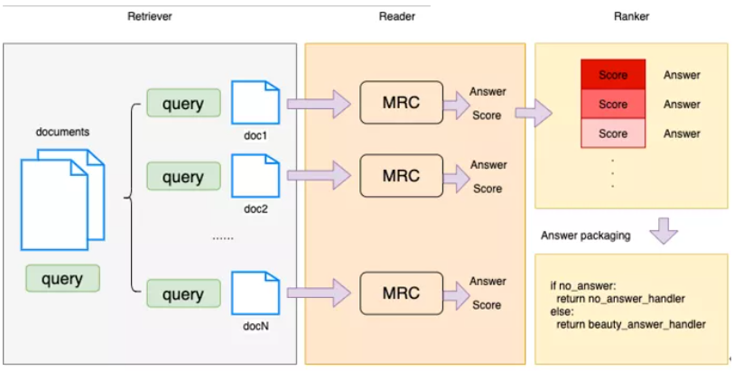 綜上,一個(gè)Document QA模型的整體架構(gòu)可以分為三層:文檔提取(Retriever)、答案提取(Reader)、答案排序(Ranker)。