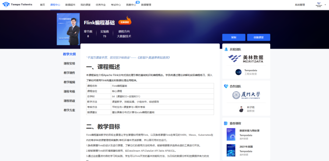 以【Flink編程基礎(chǔ)】為例,該課程是美林?jǐn)?shù)據(jù)聯(lián)合教學(xué)名師—廈門大學(xué)林子雨老師,共同打造的專業(yè)課程,包含完整的教學(xué)大綱以及配套的課程實驗、教學(xué)課件、教學(xué)視頻、課程考核、課程思政、教案等資源。