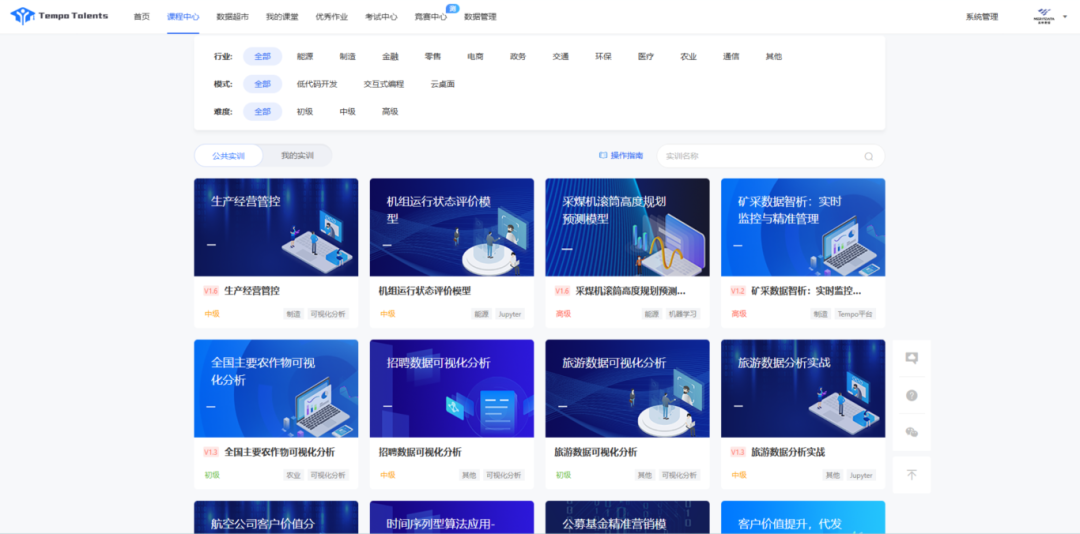 應(yīng)用實訓(xùn)案例覆蓋了能源、制造、金融、零售、電商等多個行業(yè),支持低代碼開發(fā)、交互式編程、云桌面等多種的實驗?zāi)J?,為不同方向、不同學(xué)科的學(xué)生提供了大數(shù)據(jù)實踐機(jī)會,使他們在實際操作中深化理論知識,提升技能水平。