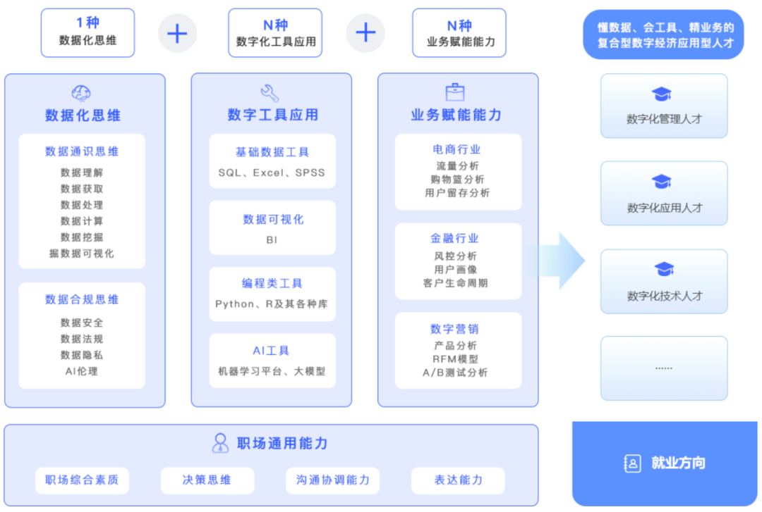 02培養(yǎng)目標(biāo) 美林?jǐn)?shù)據(jù)旨在培養(yǎng)具備扎實(shí)的經(jīng)濟(jì)學(xué)知識(shí)、管理學(xué)基礎(chǔ),具有數(shù)據(jù)思維,又能熟練運(yùn)用現(xiàn)代數(shù)字化工具技術(shù),掌握數(shù)字資源處理方法,熟悉我國(guó)數(shù)字經(jīng)濟(jì)運(yùn)行規(guī)律與改革實(shí)踐,能夠勝任政府機(jī)構(gòu)及企事業(yè)單位數(shù)字經(jīng)濟(jì)工作,適應(yīng)地方經(jīng)濟(jì)建設(shè)和社會(huì)發(fā)展的高素質(zhì)復(fù)合型應(yīng)用人才。緊密結(jié)合市場(chǎng)需求,注重學(xué)生綜合素質(zhì)和實(shí)踐能力的培養(yǎng),確保畢業(yè)生能夠在數(shù)字經(jīng)濟(jì)領(lǐng)域迅速適應(yīng)并發(fā)揮重要作用。