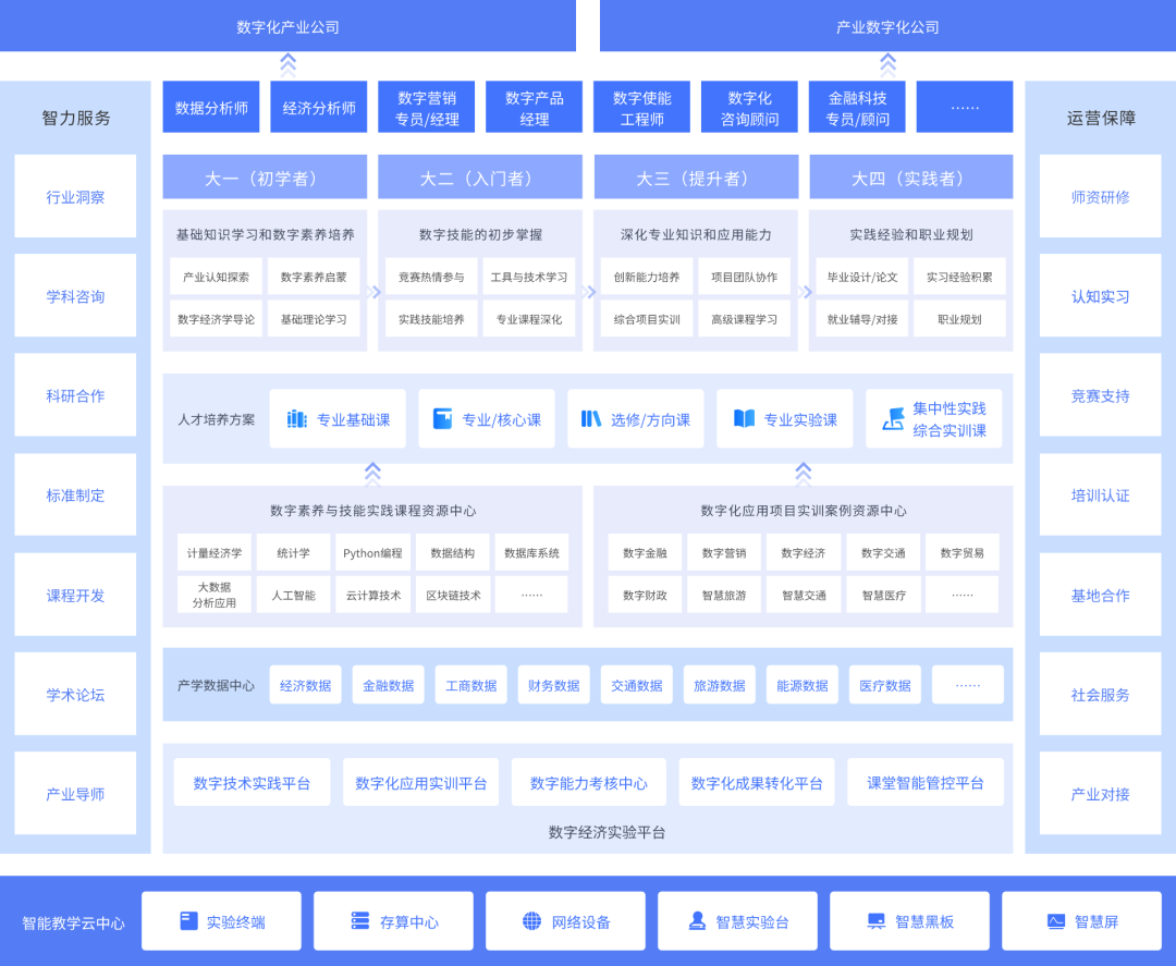 從教學(xué)資源、實(shí)踐方式著手,注重真實(shí)的產(chǎn)業(yè)實(shí)戰(zhàn)應(yīng)用能力培養(yǎng),搭建數(shù)字經(jīng)濟(jì)實(shí)踐教學(xué)基礎(chǔ)環(huán)境和數(shù)字經(jīng)濟(jì)應(yīng)用能力成長(zhǎng)平臺(tái)基座,服務(wù)于專(zhuān)業(yè)通識(shí)/基礎(chǔ)課程、專(zhuān)業(yè)/核心課程、選修/方向課程、專(zhuān)業(yè)實(shí)驗(yàn)課、集中實(shí)踐/綜合實(shí)訓(xùn)課的實(shí)踐教學(xué)與應(yīng)用實(shí)訓(xùn),強(qiáng)化師生數(shù)字化技術(shù)工具應(yīng)用和創(chuàng)新能力。