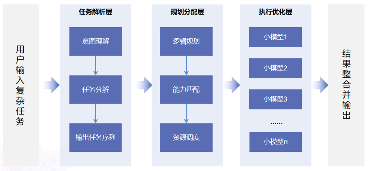大模型在任務(wù)解析層負(fù)責(zé)接收用戶指令并理解用戶復(fù)雜需求,然后在規(guī)劃分配層將一個(gè)復(fù)雜的任務(wù)分解成多個(gè)較為簡(jiǎn)單的小任務(wù),并進(jìn)行執(zhí)行順序的邏輯規(guī)劃;小模型則在執(zhí)行層專注處理細(xì)分任務(wù),發(fā)揮其專業(yè)精度和高效執(zhí)行的優(yōu)勢(shì)。