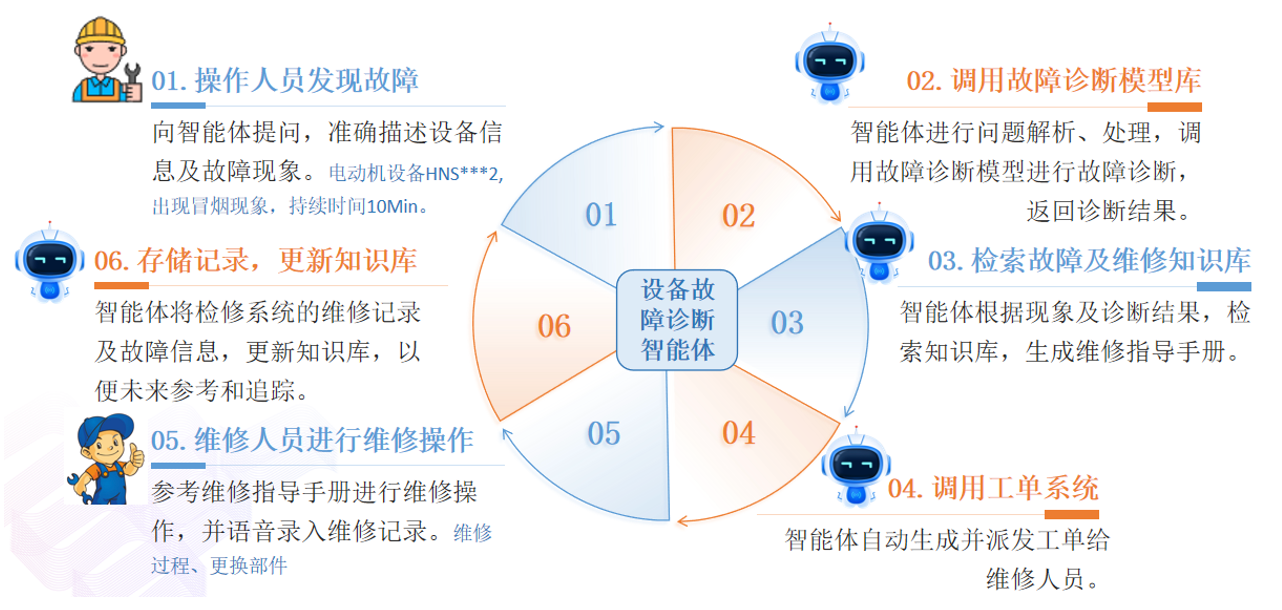 在設(shè)備故障診斷領(lǐng)域,為制造企業(yè)構(gòu)建了設(shè)備故障診斷智能體,大模型負(fù)責(zé)接收員工提出的設(shè)備故障的相關(guān)信息,并進(jìn)行理解和任務(wù)規(guī)劃,故障診斷模型庫(kù)中的小模型負(fù)責(zé)各類故障的診斷,大模型再通過(guò)診斷結(jié)果調(diào)用知識(shí)庫(kù)獲取故障處理措施然后反饋給員工。