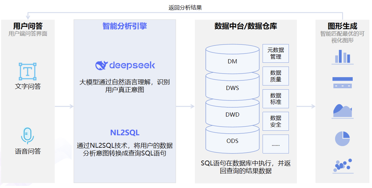 深度整合企業(yè)數(shù)據(jù)中臺/數(shù)倉中的中間表、結(jié)果表等核心數(shù)據(jù)資產(chǎn),構(gòu)建覆蓋全業(yè)務(wù)鏈條的數(shù)據(jù)問答體系。大模型通過自然語言理解技術(shù),精準解析用戶復(fù)雜查詢意圖,將語義指令轉(zhuǎn)化為高效查詢語句。在數(shù)據(jù)執(zhí)行層,結(jié)合元數(shù)據(jù)管理模塊自動匹配字段映射關(guān)系,同時通過數(shù)據(jù)質(zhì)量校驗機制確保查詢結(jié)果的準確性。